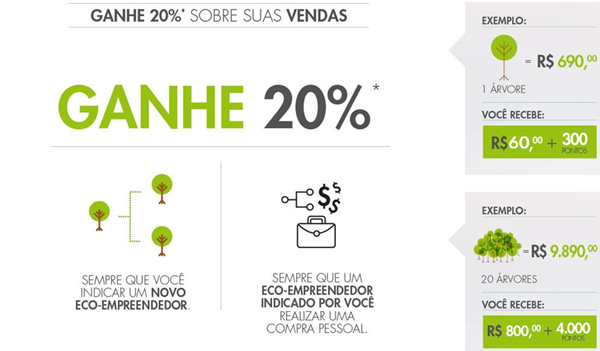 Ganhe 20% Sobre Suas Vendas! Você vai ganhar 20% Na Venda Sempre que você indicar um novo Eco - Empreendedor e Sempre que um Eco-Empreendedor indicador por você realizar uma compra pessoal.