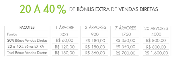 Campanha Bônus Venda Direta Extra, Você ganha 20% a 40% de Bônus extra de Vendas Diretas, Exemplo: Na Venda de 1 Árvore resulta em 300 Pontos, R$ 60,00 De Bônus Vendas Diretas, R$ 120,00 de Bônus Extra.